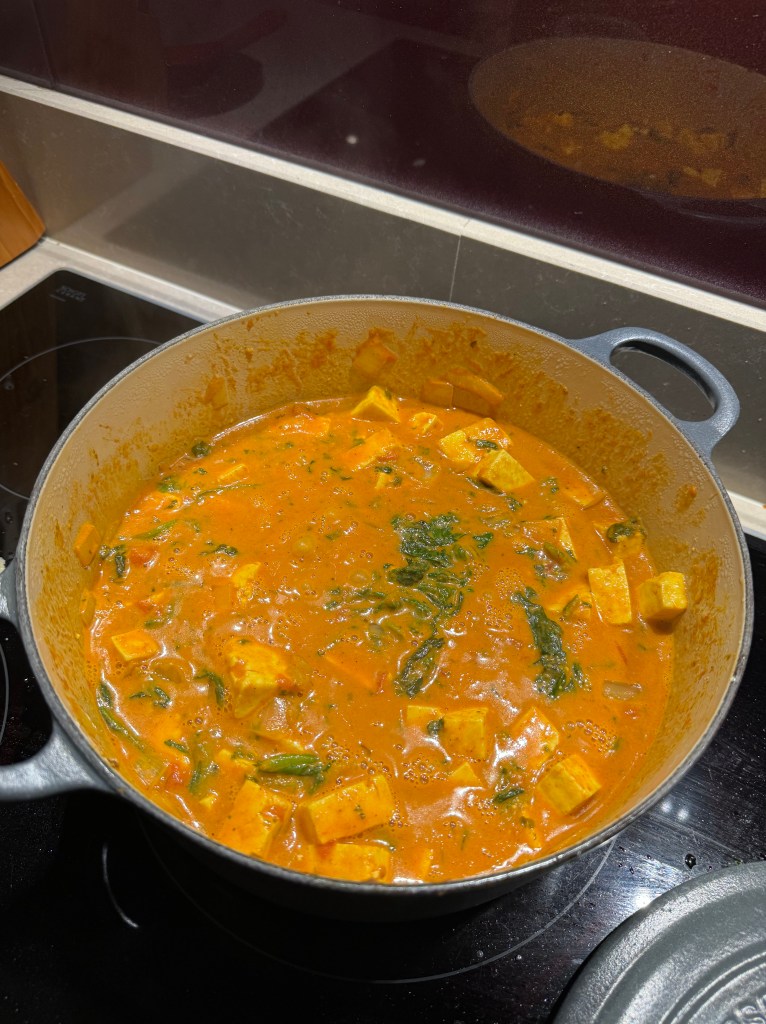 Over a medium heat, gently cook the onions. Add the paneer and stir – be careful it doesn’t stick. Stir through the curry paste and cook for a few mins. Add the garlic. Throw in your tomatoes and coconut cream, then the spinach. Leave to simmer gently for 10-15 minutes to reduce a bit.